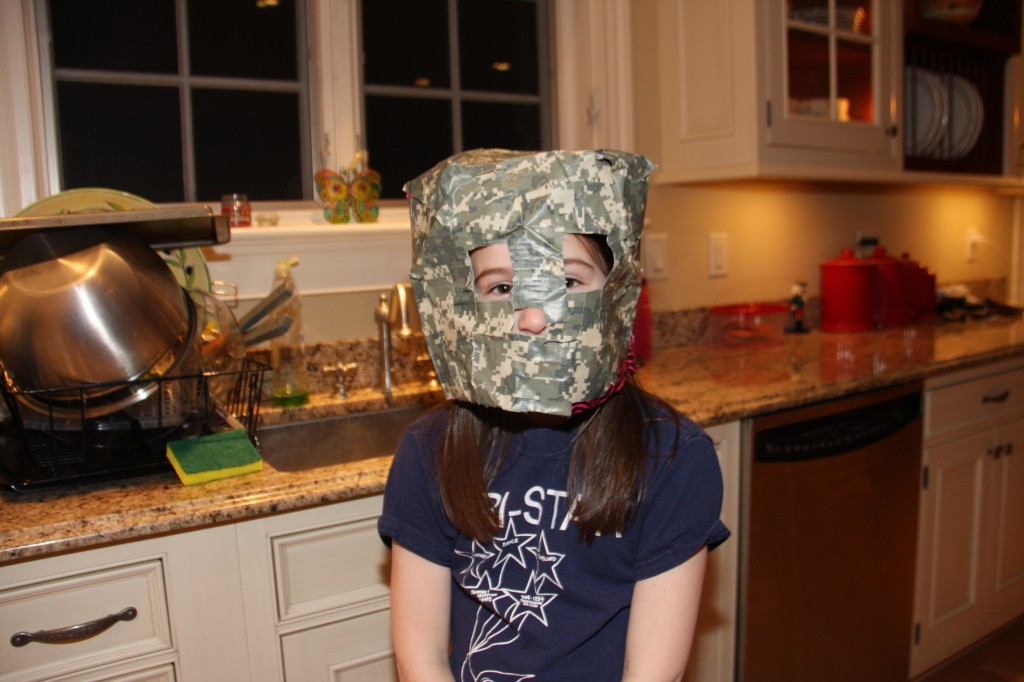 for Christmas, you got some cool duct tape in all different colors and patterns. You've been busy making different things, or shall I say, inventing different things. Here's your latest concoction: a helmet made of "camouflage" tape. You have a very active imagination and are a creative girl!