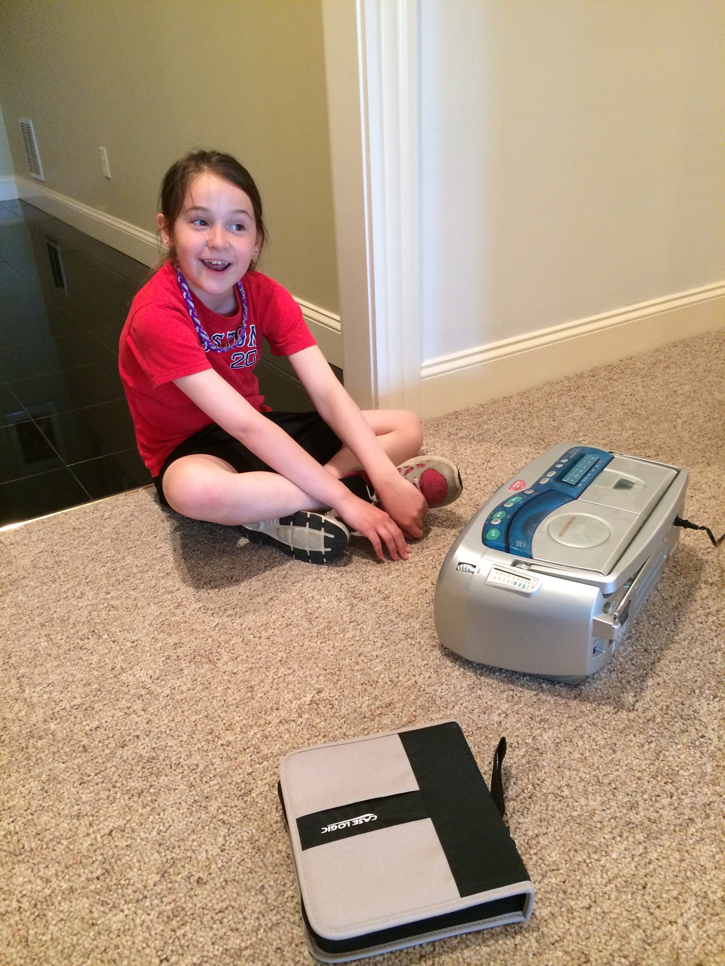 Your favorite thing was a music playing device that lets you listen to a cassette, mini disc, CD or the radio! It was made in Japan and all the knobs and instructions are in Japanese – so it took us a while to figure out how to make things open, close, move forward and stop. Here you are with it: